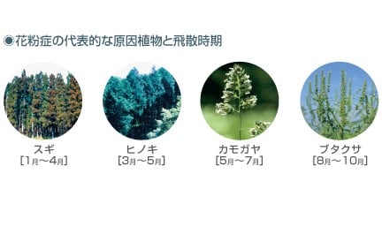 スギ、ヒノキ科、ブタクサ、マツ、イネ科、ヨモギなど